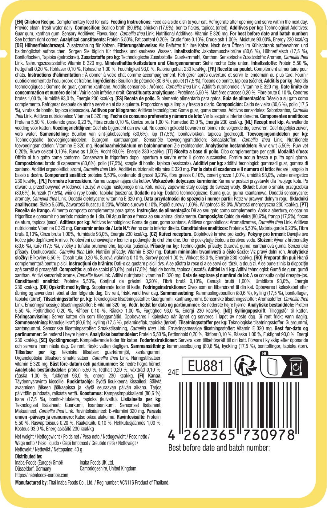 80,6 % Jakobsmuschel-Brühe, 17,5 % Hühnerfleisch, Bonitoflocken, Tapioka getrocknet, Guarkernmehl, Xanthan, Aromen