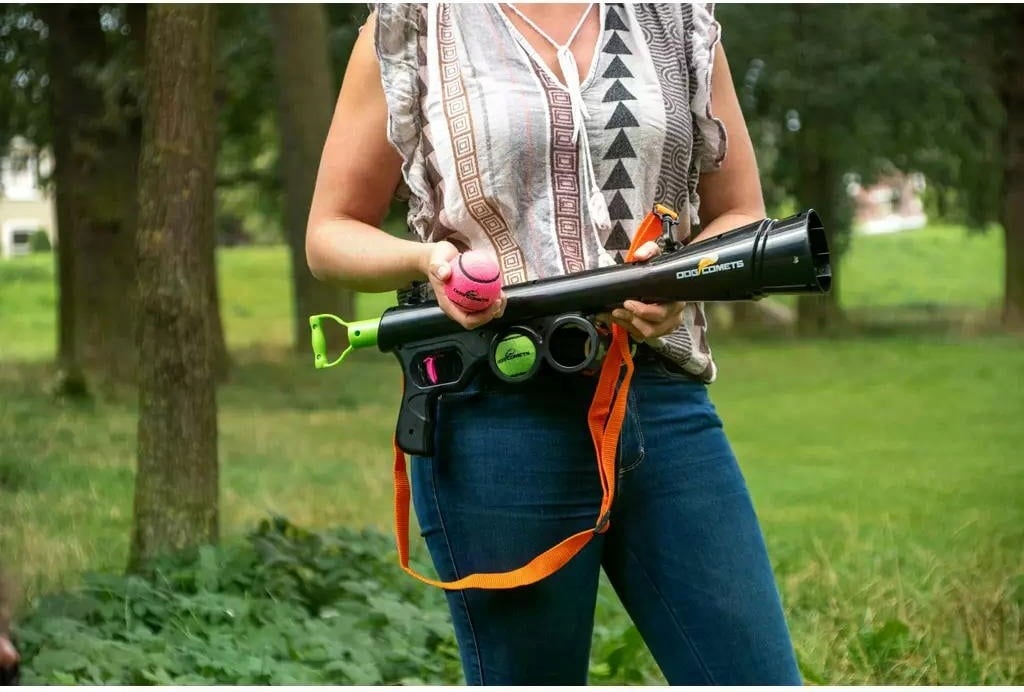 Aus extra starkem und robustem Kunststoff gefertigt hält der Launcher auch langen und fordernden Spielen stand. Und das Beste: Du erhältst nicht nur die Kanone, sondern auch 2 passende Dog Comets Tennisbälle (Größe M) und einen praktischen Tragegurt gleich mit dazu. Dank der 2 Ballhalterungen an der Seite hast du immer Ersatz parat, wenn der erste Ball im Eifer des Gefechts verloren geht.