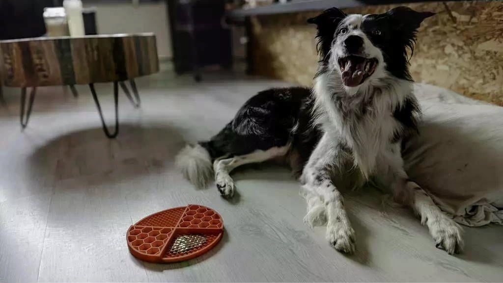 - Verteile Leckmasse, Trockenfutter oder Leckerlis auf der Matte.
