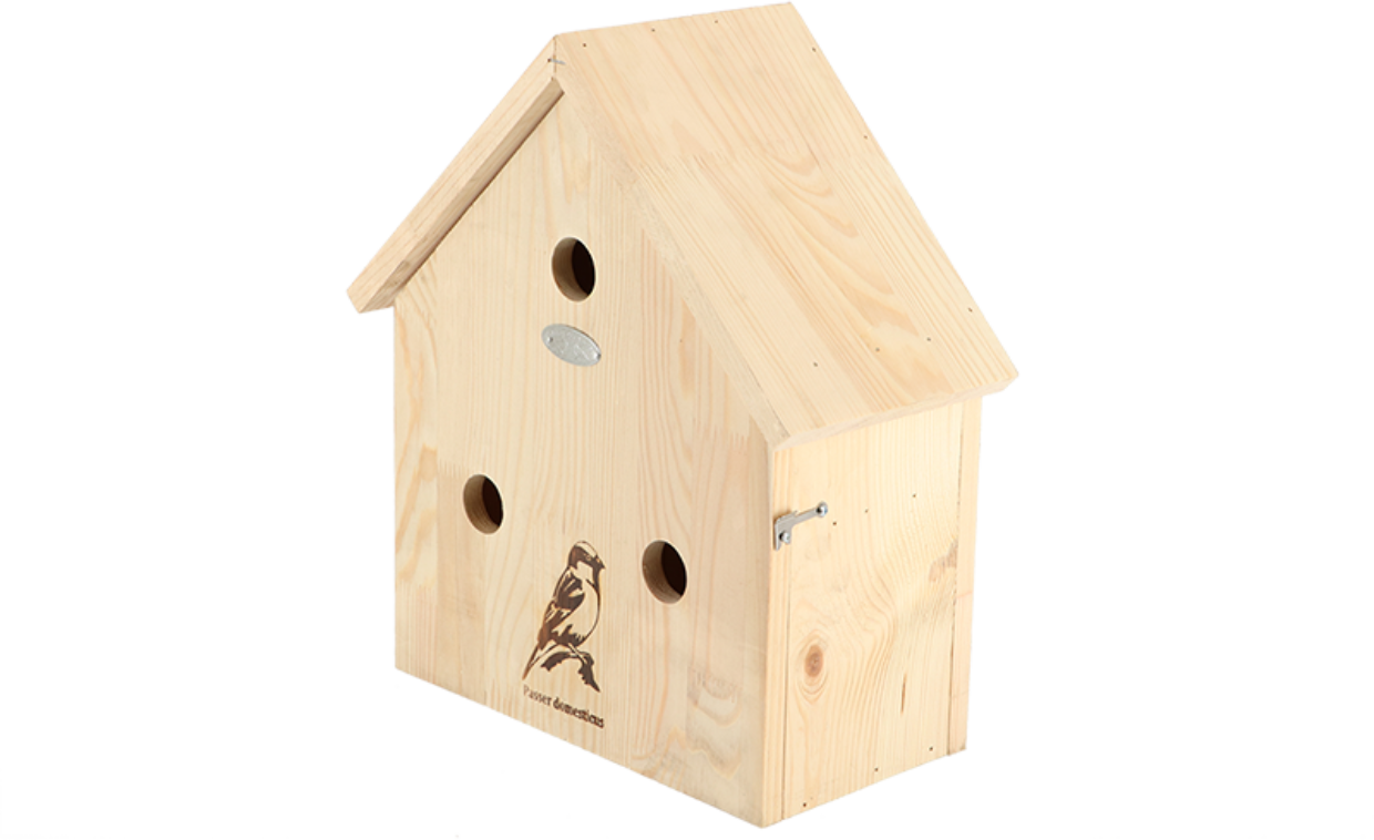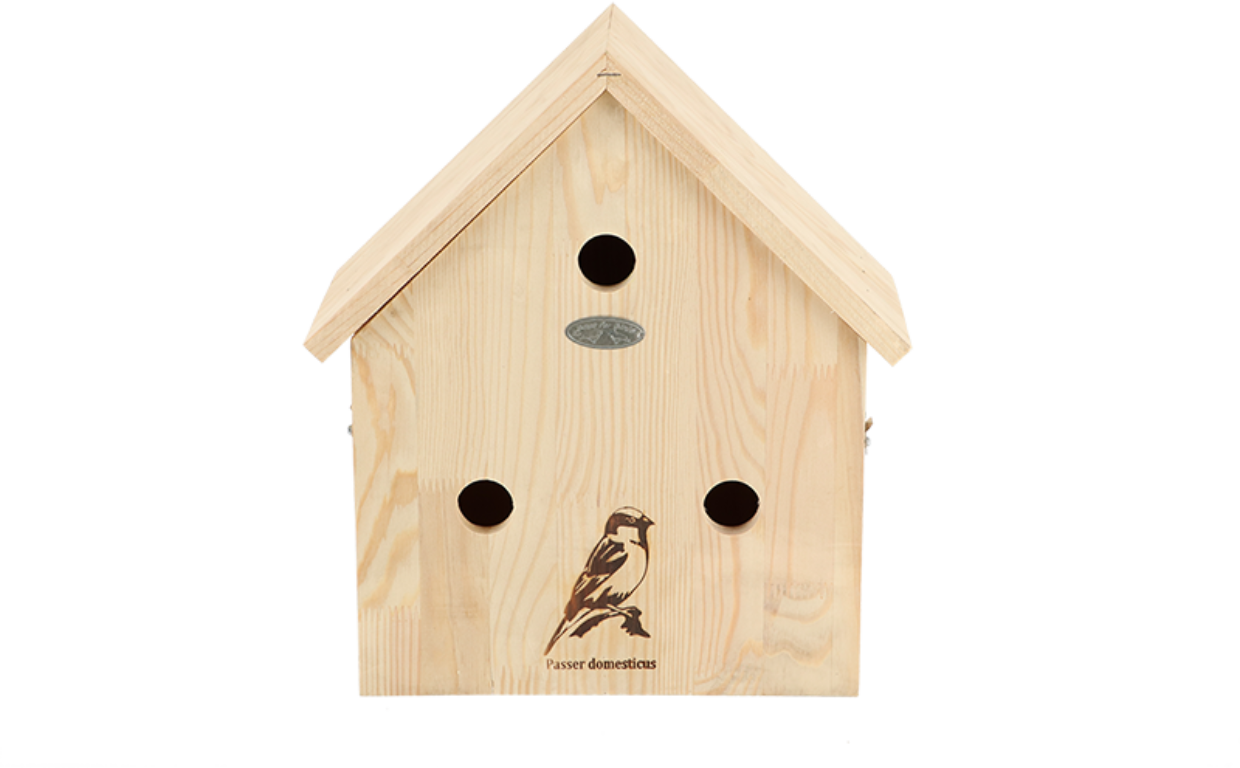 Im Gegensatz zu früher hat sich die Spatzen-Population drastisch verringert, weswegen es ein Segen für die kleinen Vögel ist, wenn ihnen ein geeigneter Nistplatz zur Verfügung gestellt wird. Da Spatzen gerne Gesellschaft haben, befinden sich in der Spatzenvilla drei komfortable Wohneinheiten. Aber nicht nur Spatzen, sondern auch Feldsperlinge, Kohlmeisen und Blaumeisen fühlen sich in dieser Villa pudelwohl.